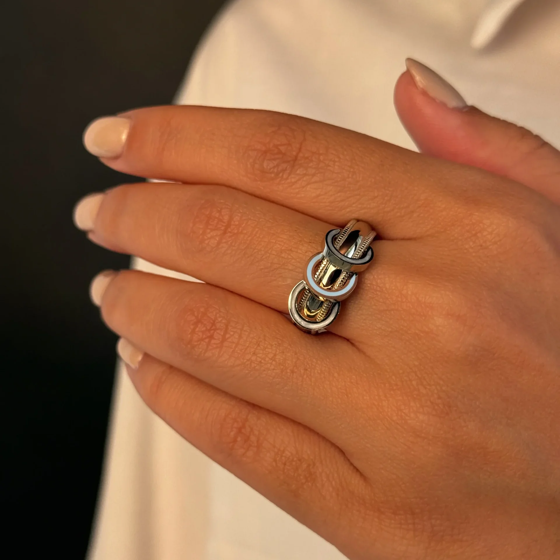 این انگشتر طلا دخترانه 18 عیار از برند پائون در است که از سه حلقه (دو حلقه صدفی و یک حلقه آبی) تشکیل شده است.