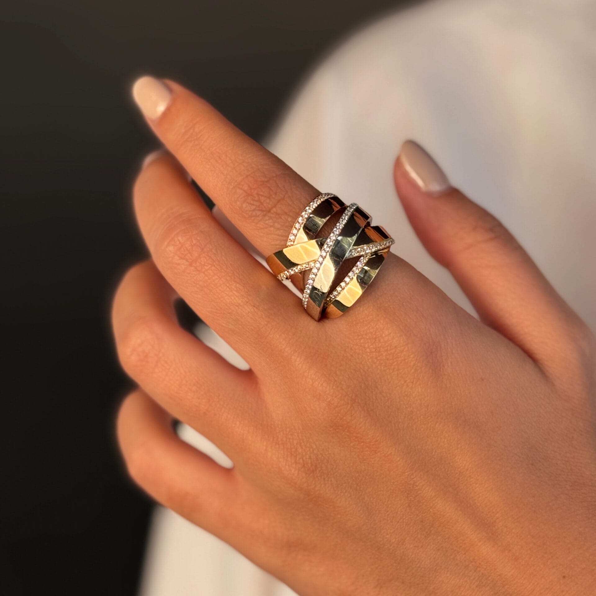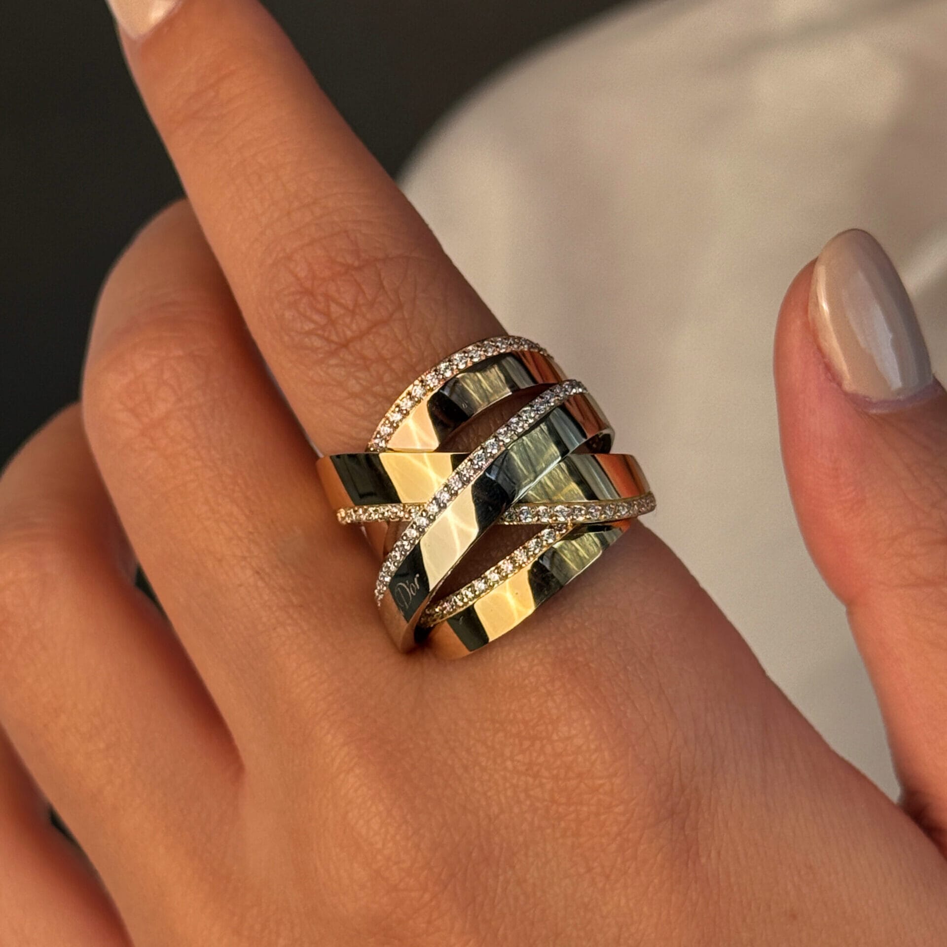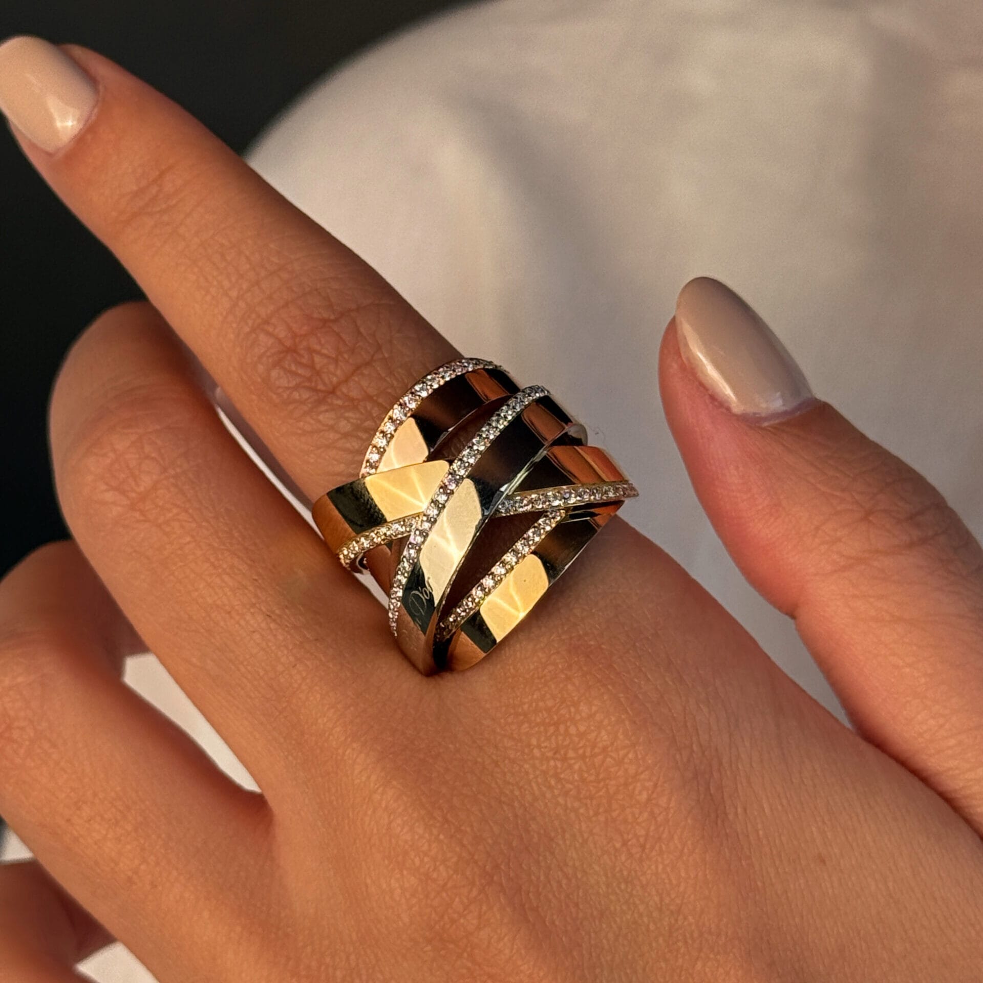 این انگشتر طلا زنانه با طلای 18 عیار ساخته شده است. طراحی آن به صورت لایه ای و نگین دار است که درخشش دستان شما را چند برابر میکند.