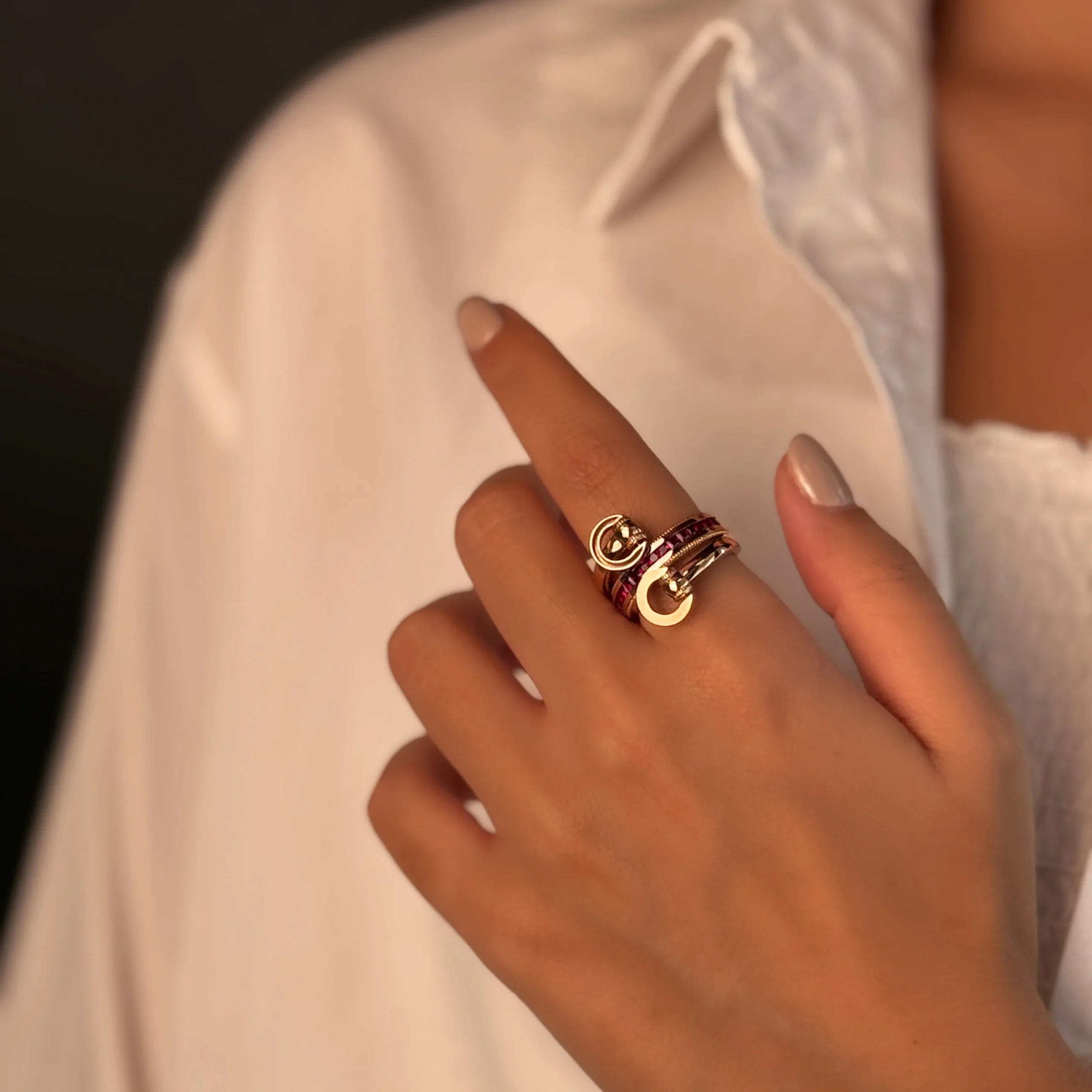 این انگشتر طلا دخترانه با طراحی سه‌ردیفه همراه با نگین‌‌های صورتی، حس درخشش و لوکس بودن را در استایل شما به وجود می‌آورد.