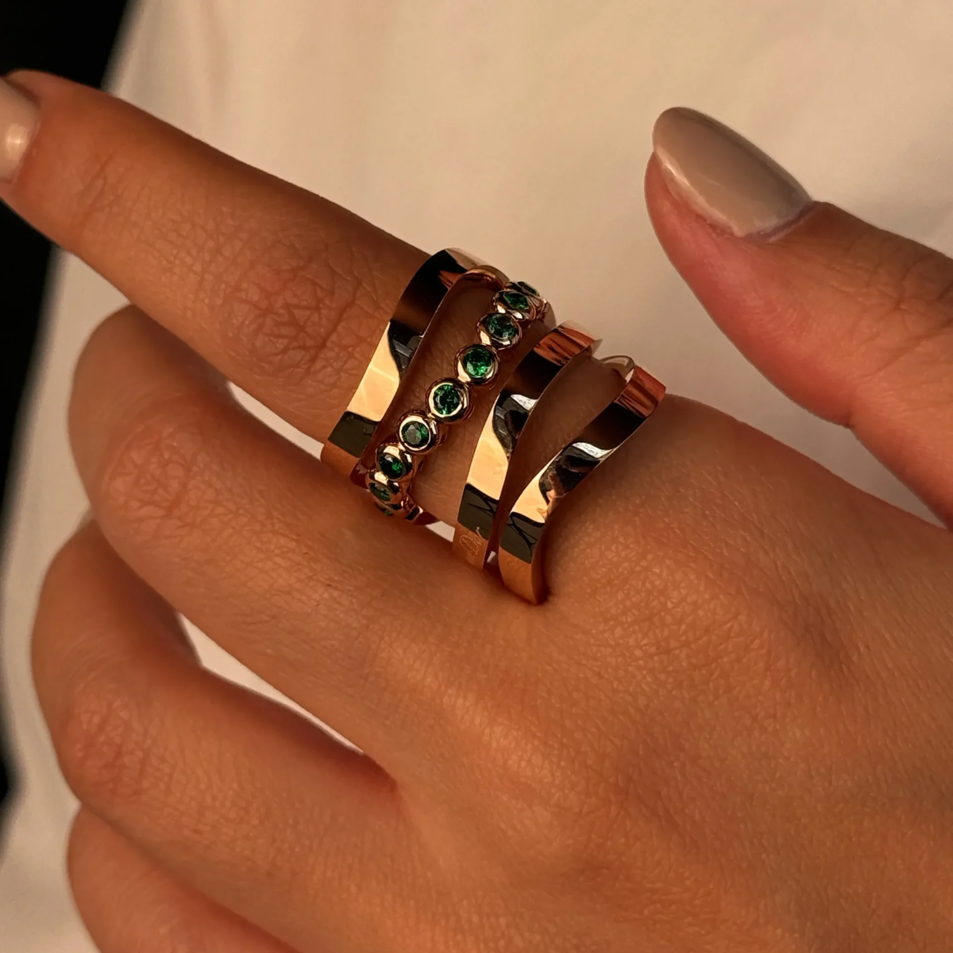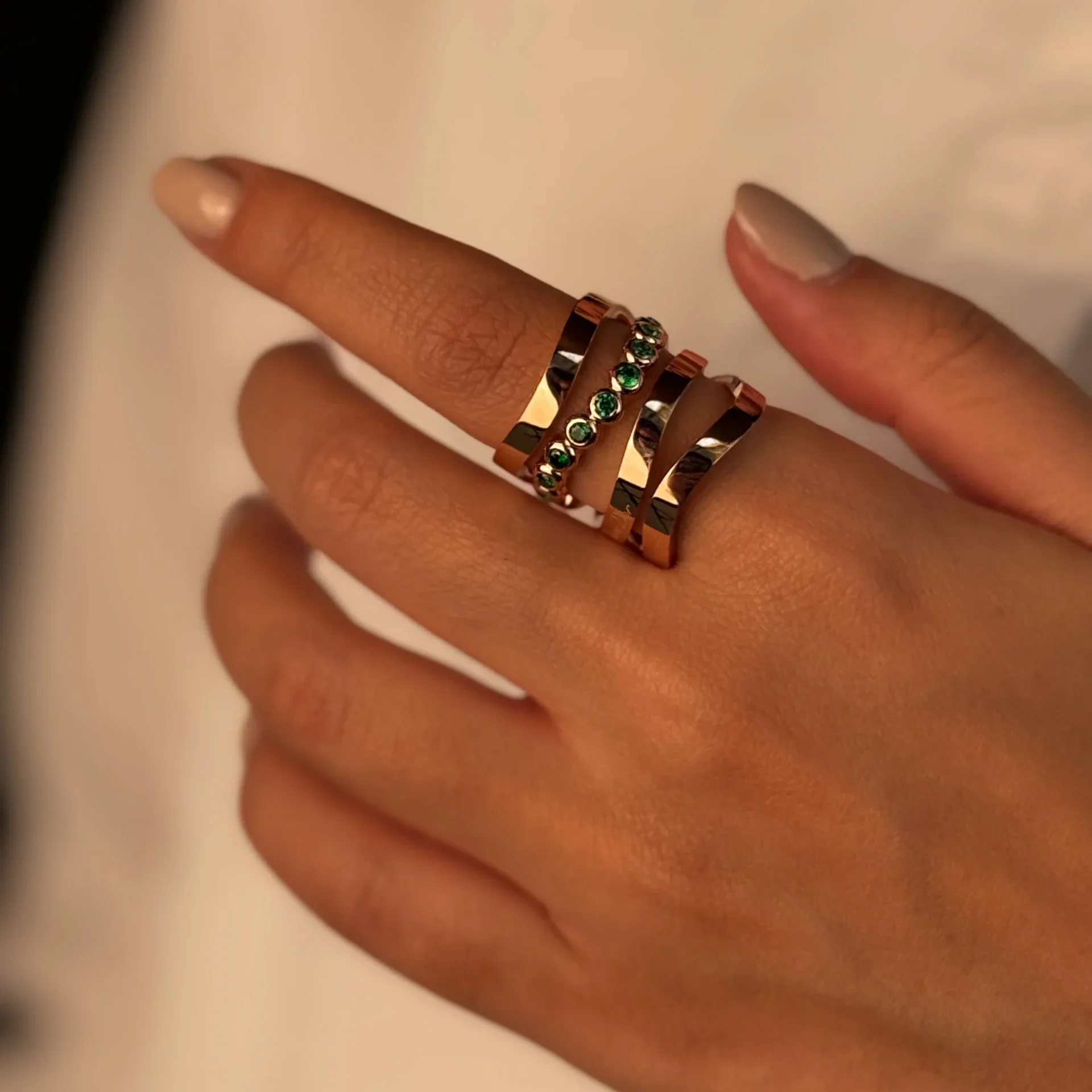 این انگشتر طلا به صورت چهار رج طراحی شده و با نگین های سبز دیزاین شده است.