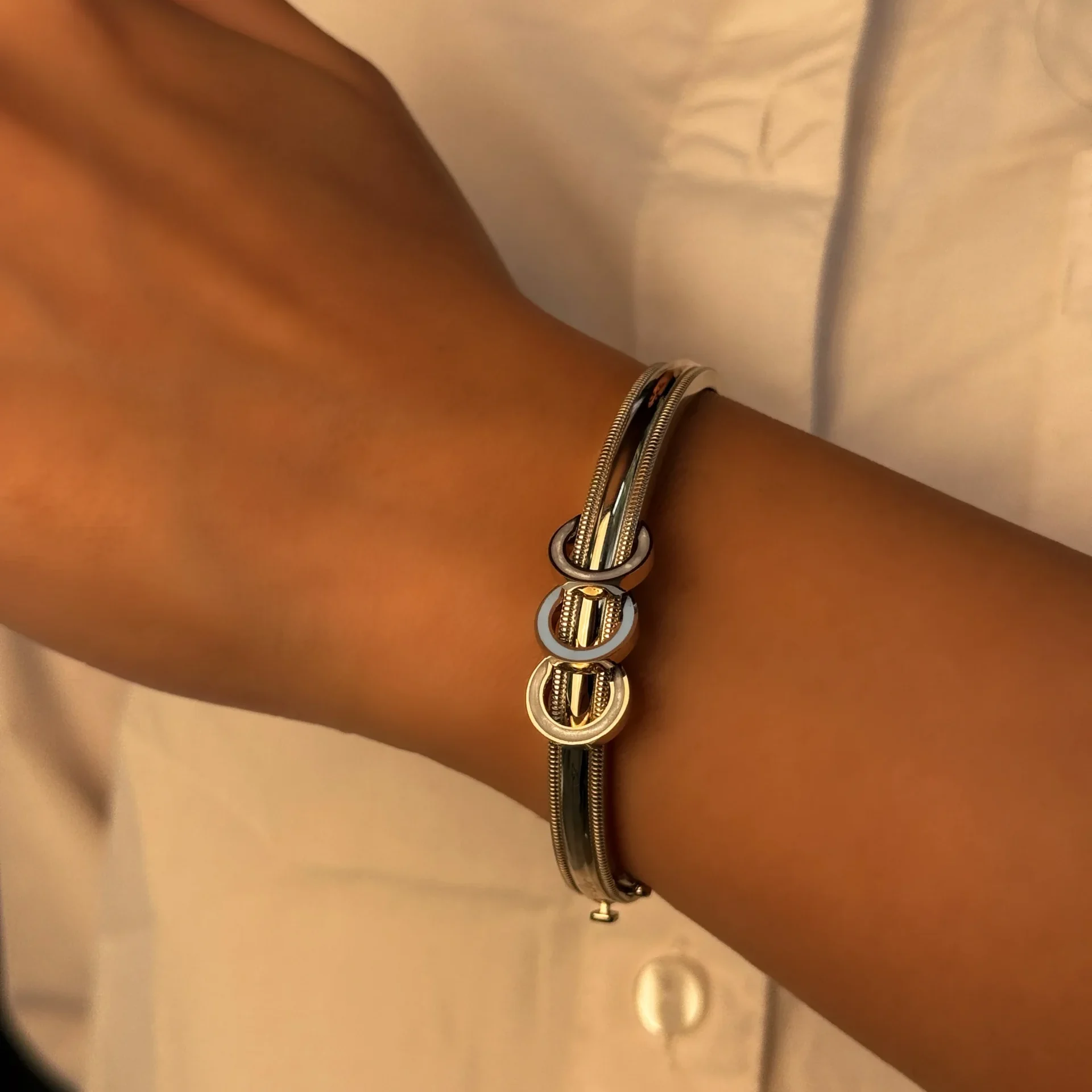 این دستبند طلا 18 عیار از برند پائون در است که از سه حلقه (دو حلقه صدفی و یک حلقه آبی) تشکیل شده است.