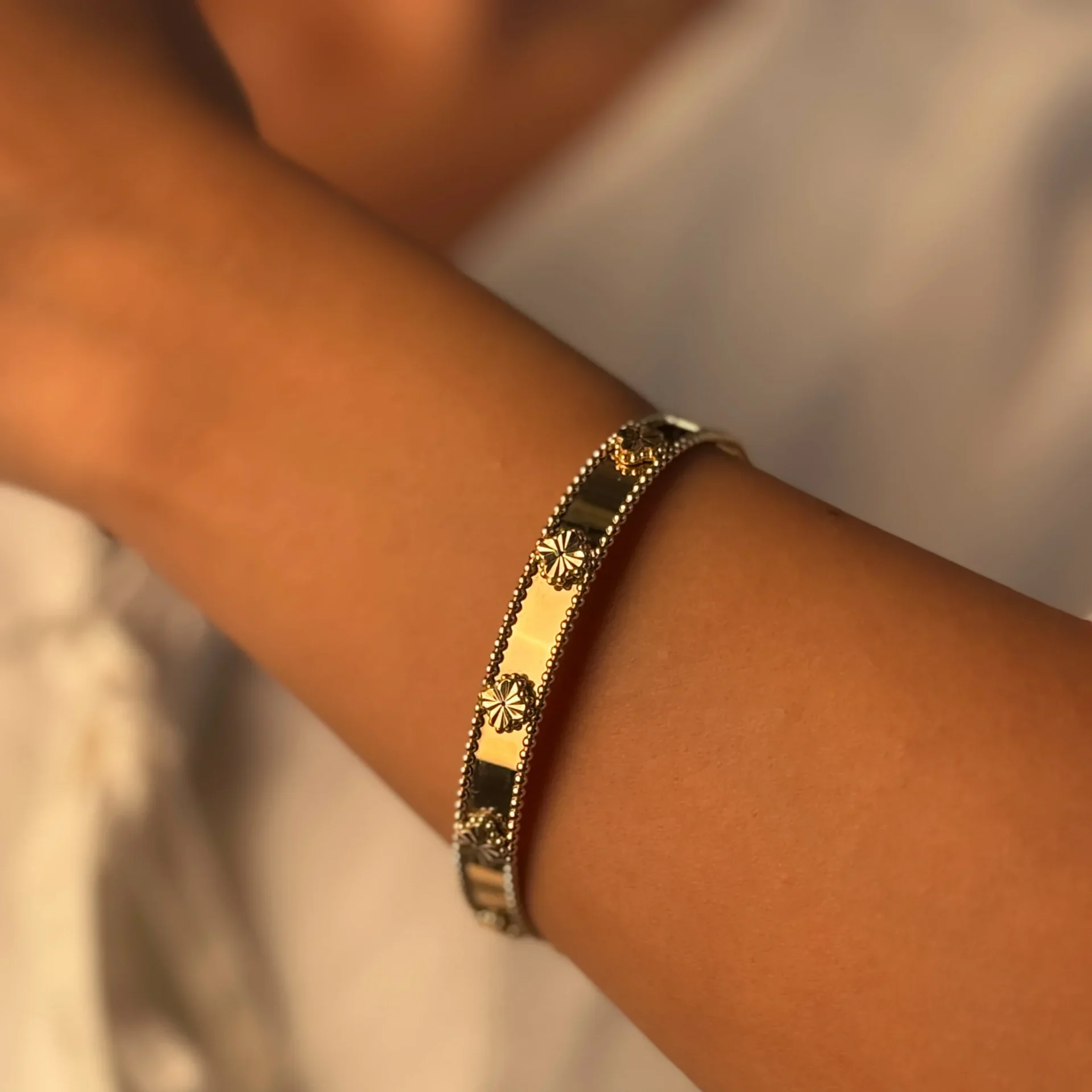 این دستبند ونکلیف زیبا با طلای 18 عیار ساخته شده و روی آن گلهای چهاپر ونکلیف به صورت برجسته کار شده است.