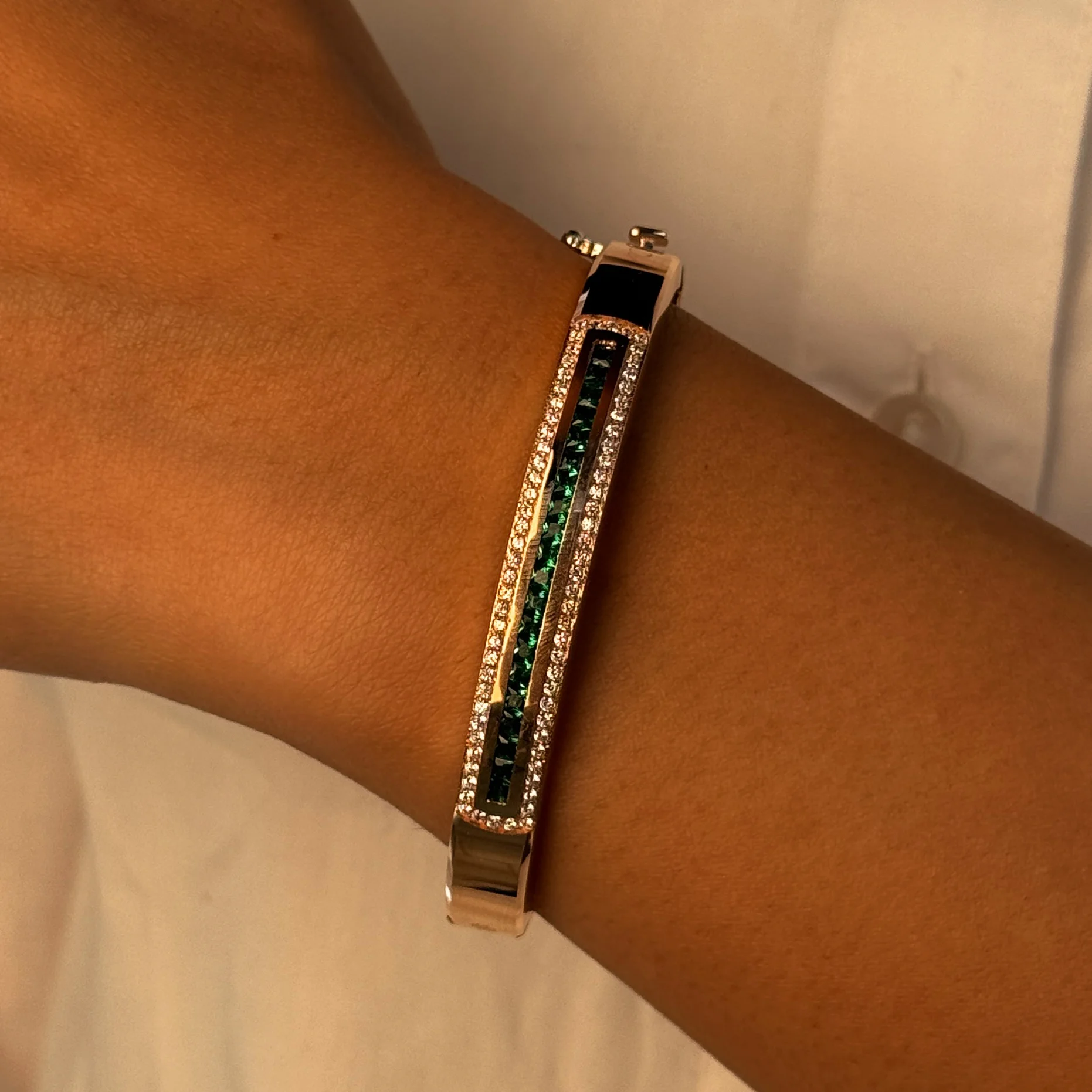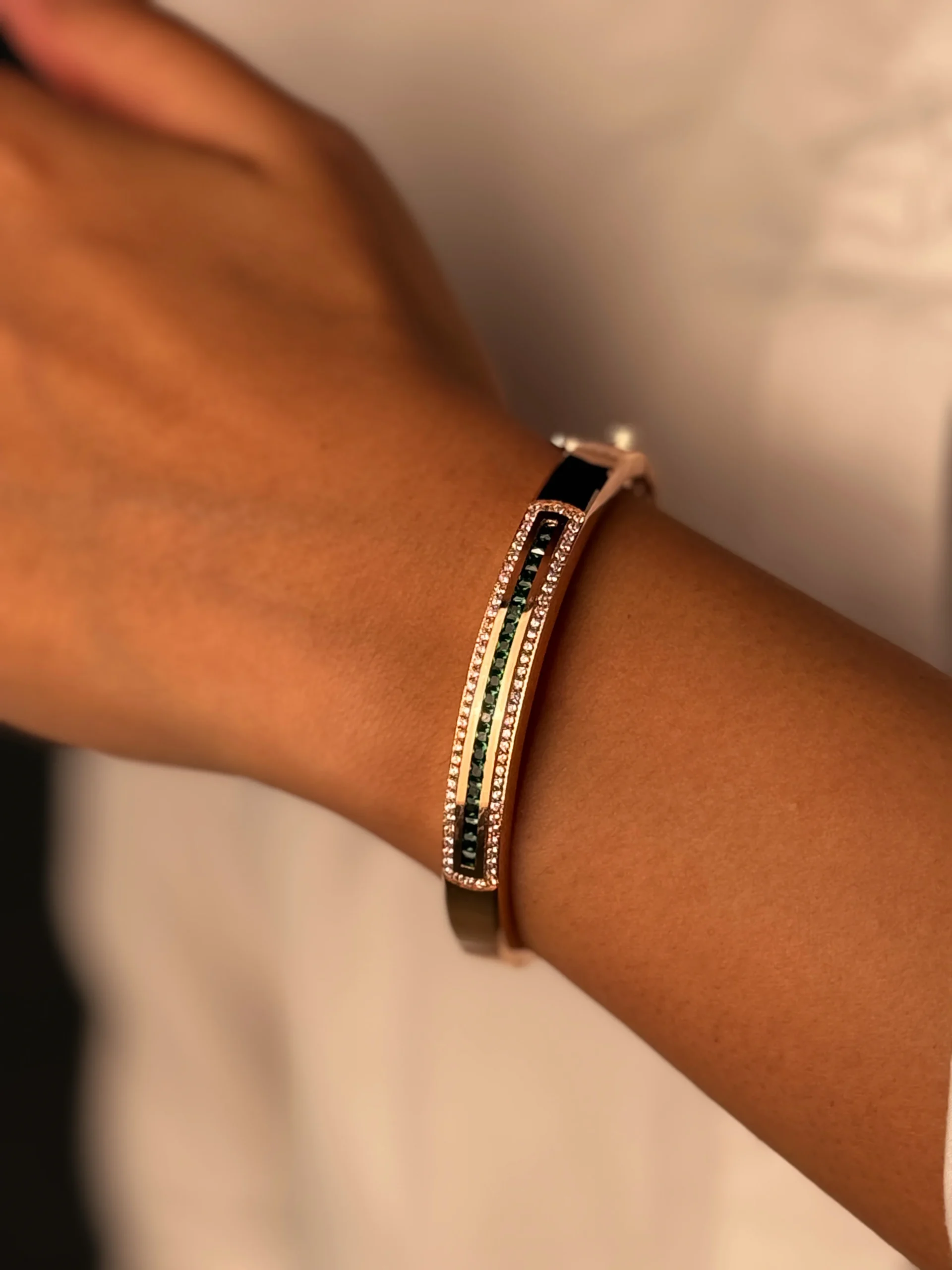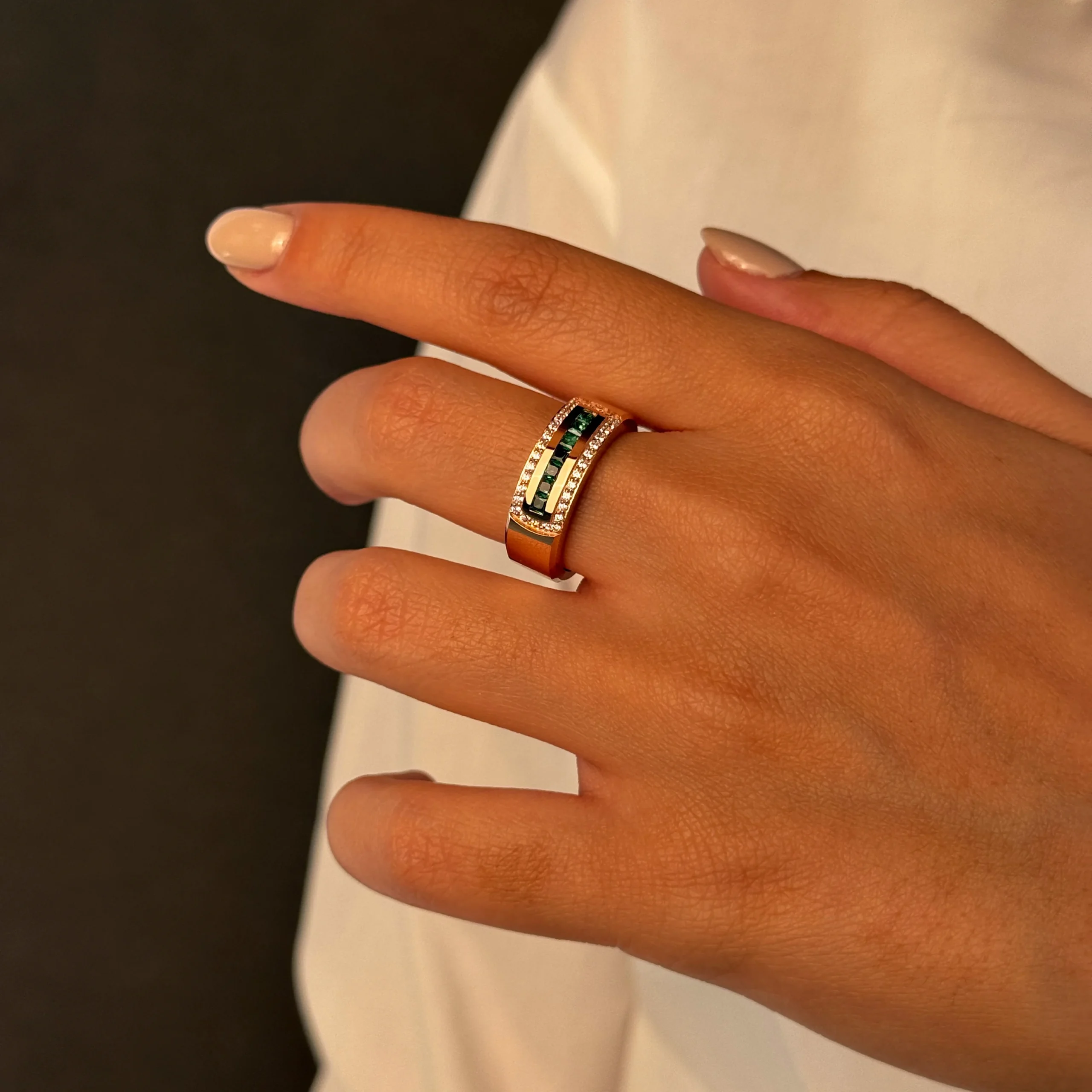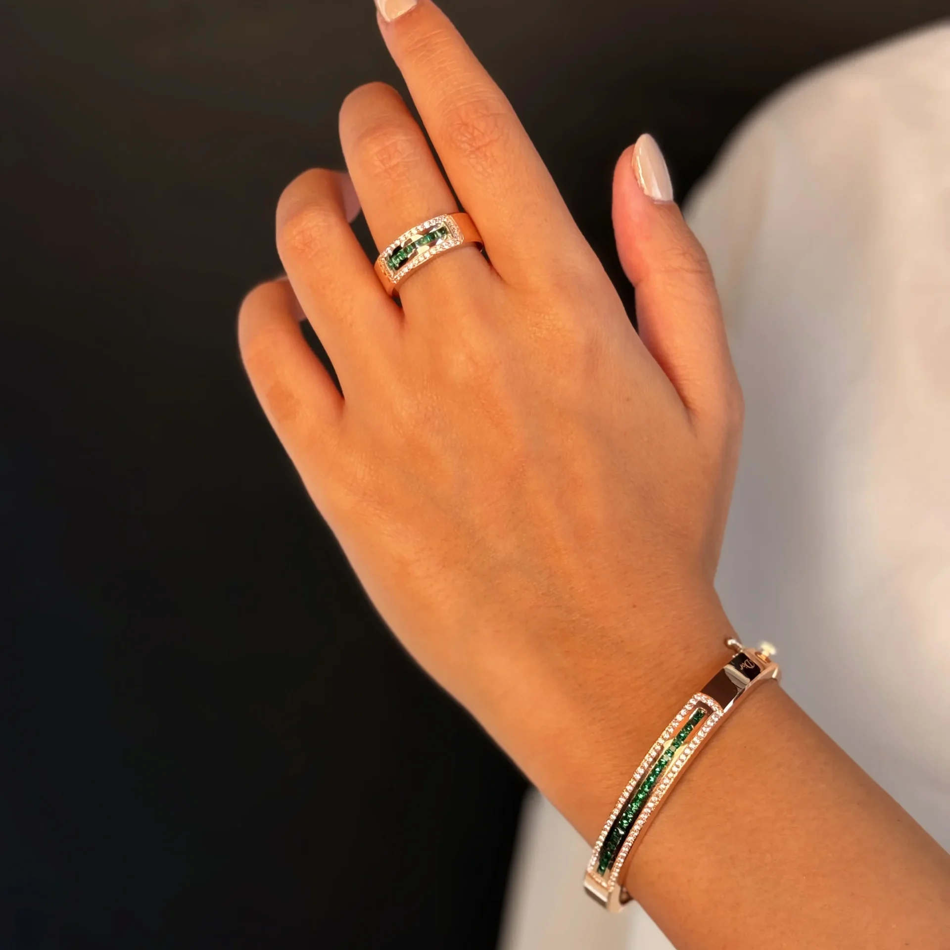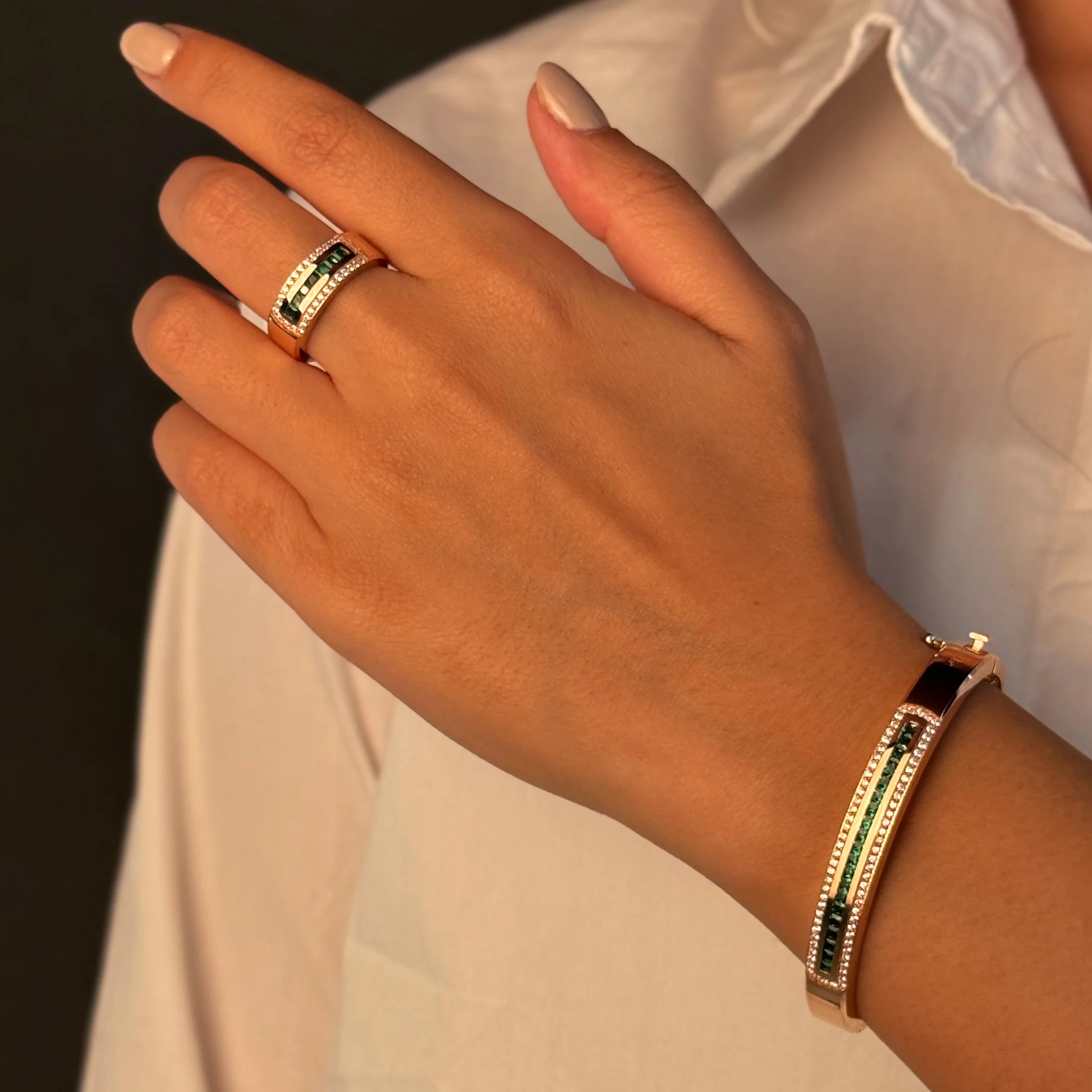 این ست انگشتر و دستبند طلا 18 عیار، از برند پائون در است که بسیار شیک و با استفاده از یک ردیف نگین سبز طراحی شده است.