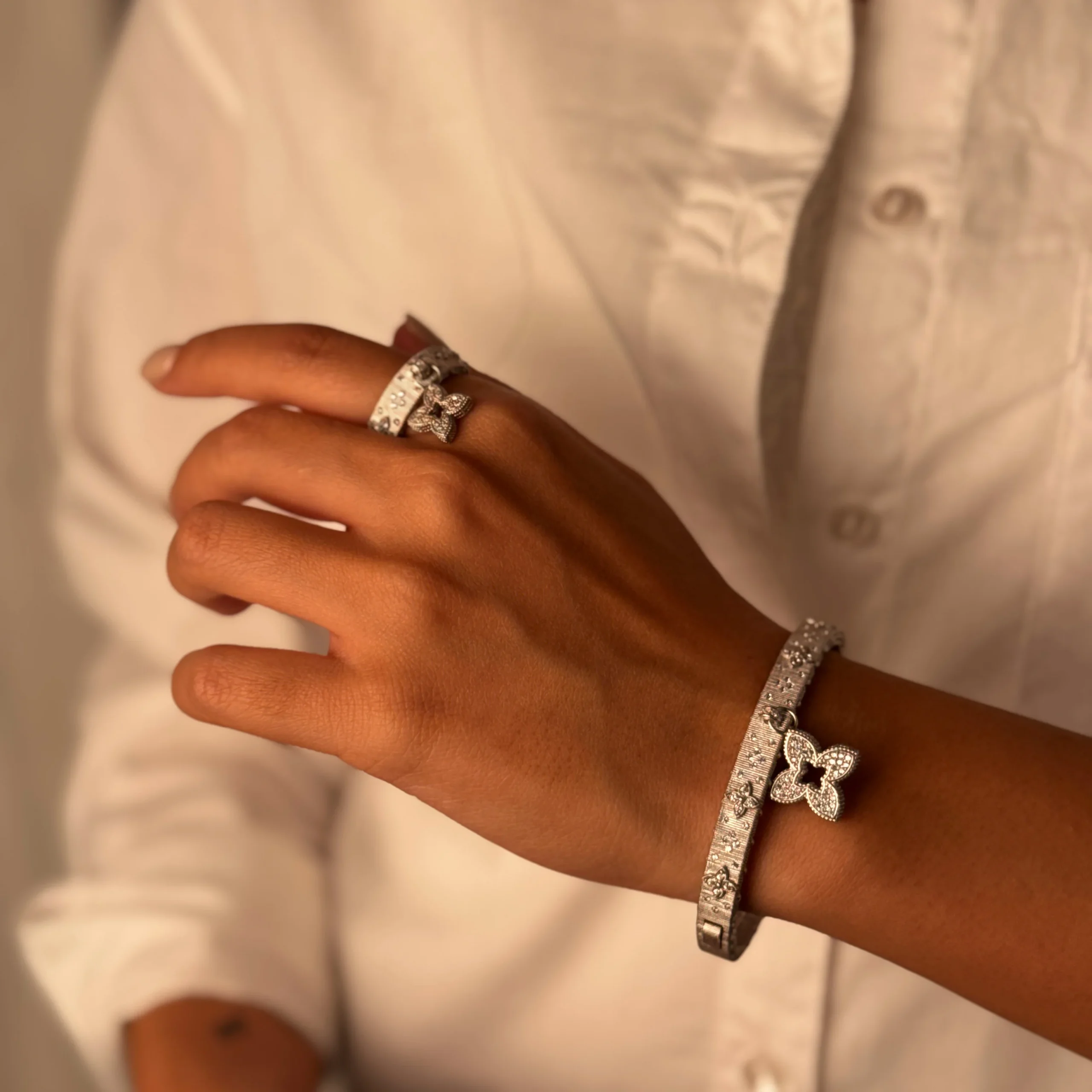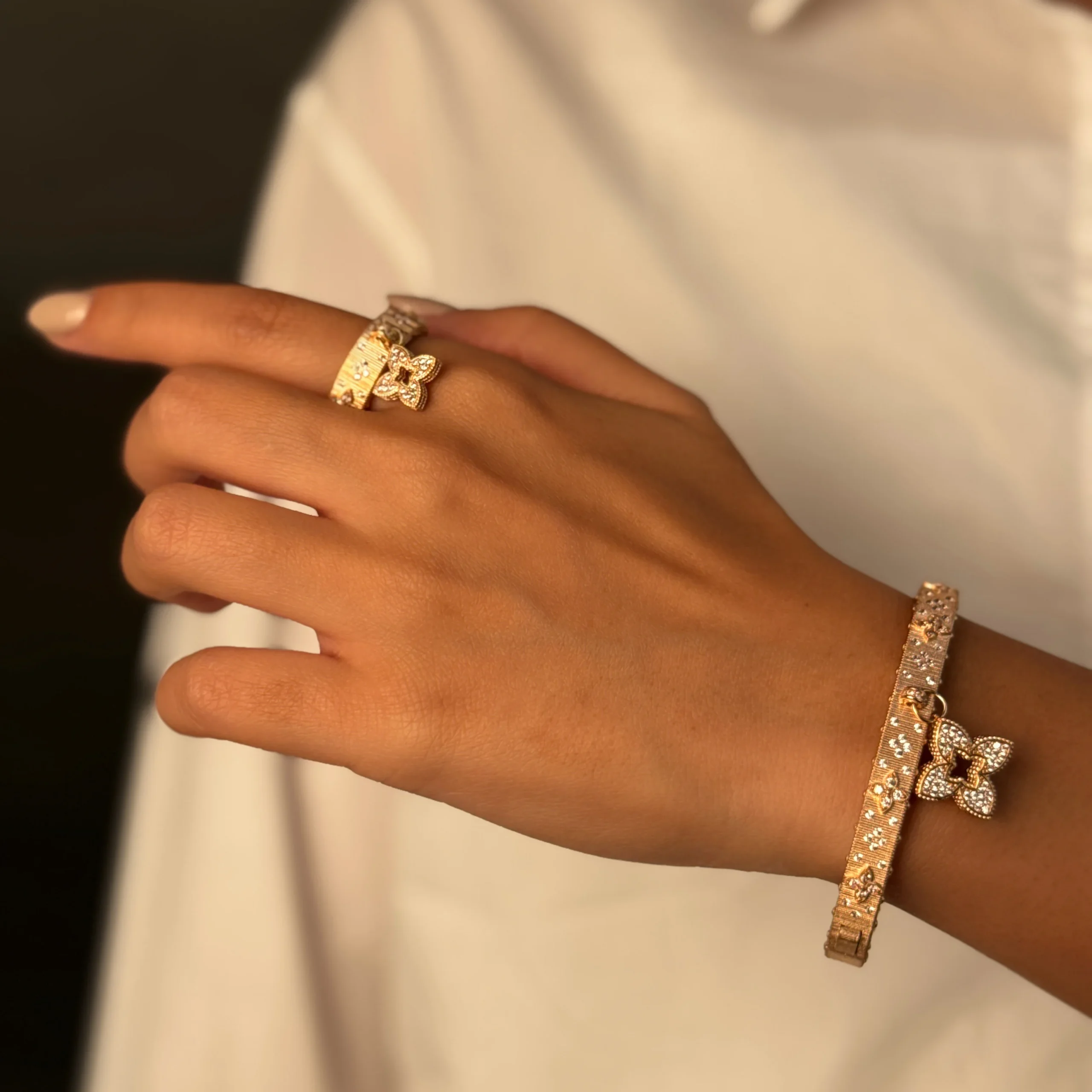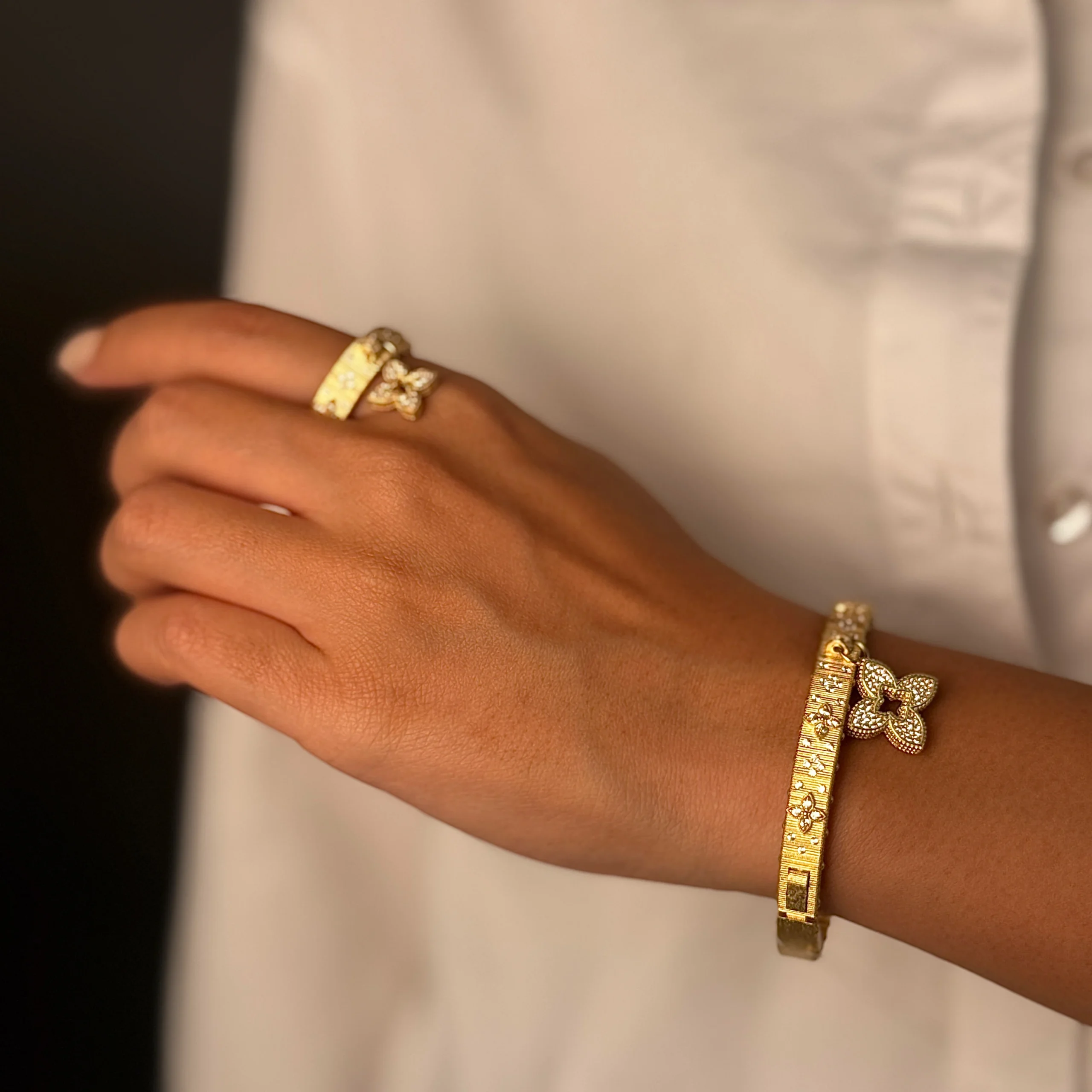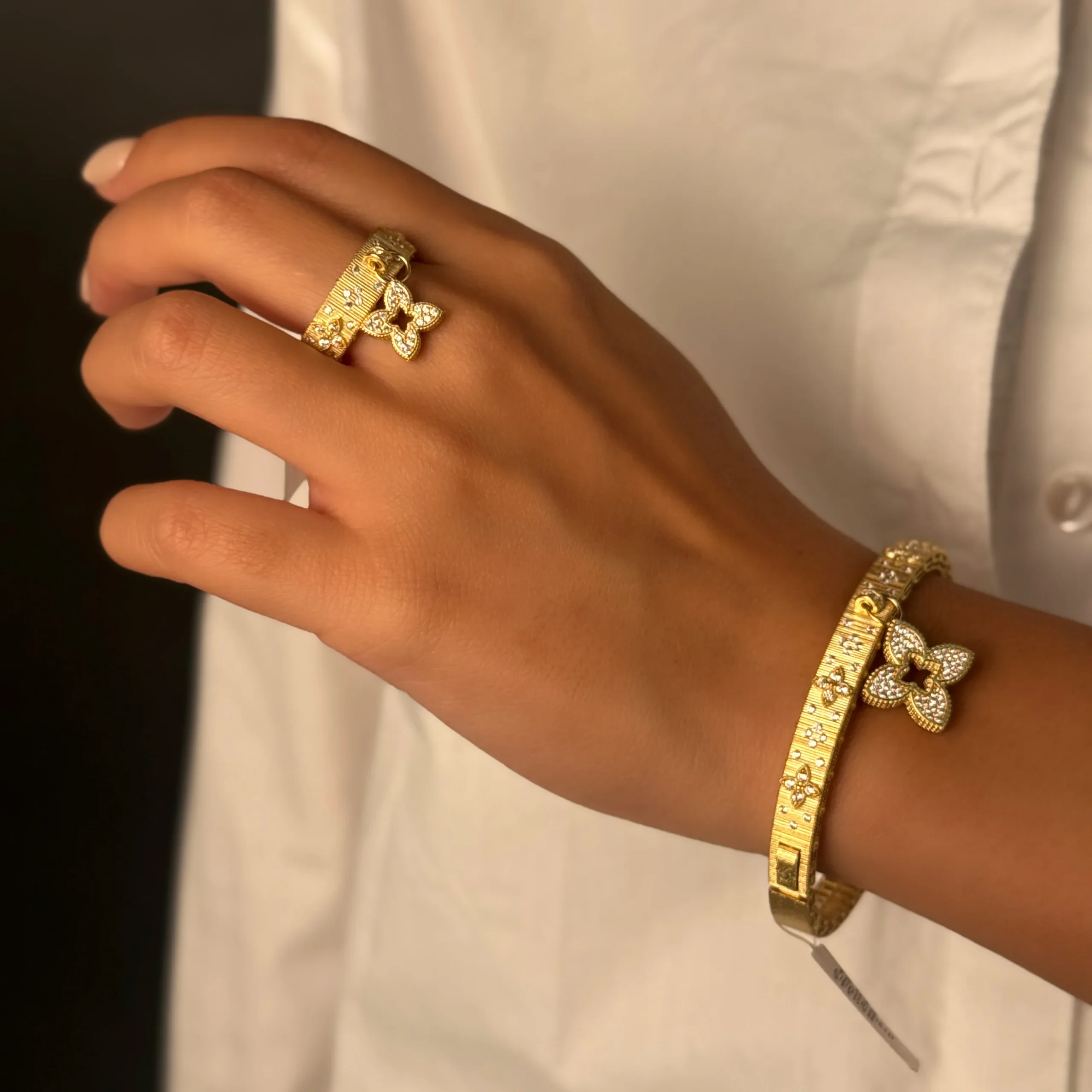 نگین های زیرکونیوم کارشده روی این ست دستبند و انگشتر طلا 18 عیار به جلوه آن افزوده است.