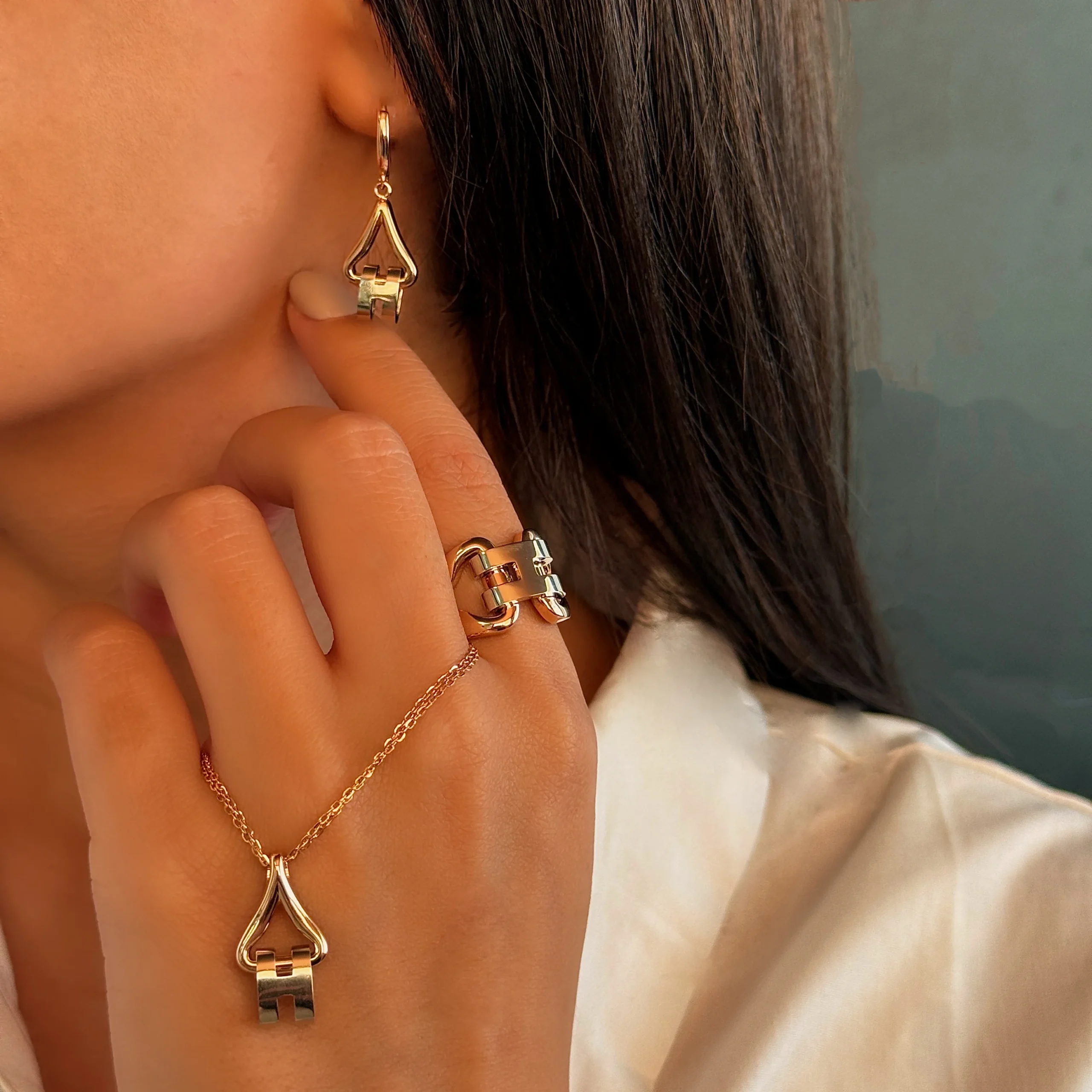 این نیم ست طلا طرح H شامل گردنبند، گوشواره و انگشتر زیبا مناسب استایل رسمی و اسپرت است.